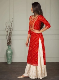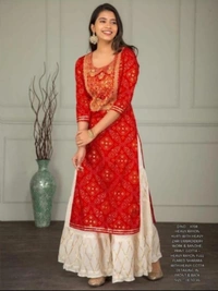 Kurta Fabric: RayonBottomwear Fabric: RayonFabric: RayonSleeve Length: Three-Quarter SleevesSet Type: Kurta With BottomwearBottom Type: Sharara